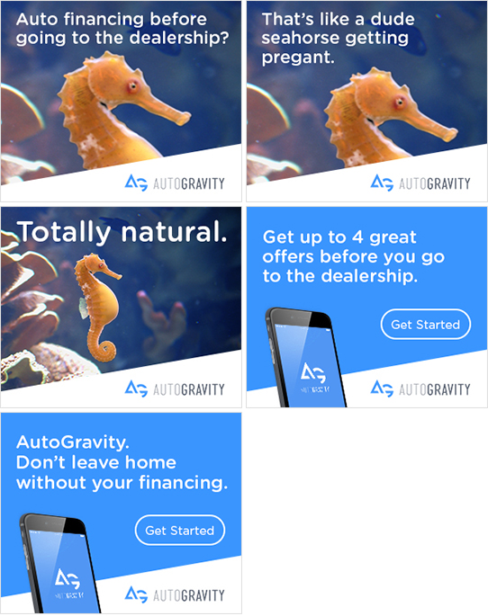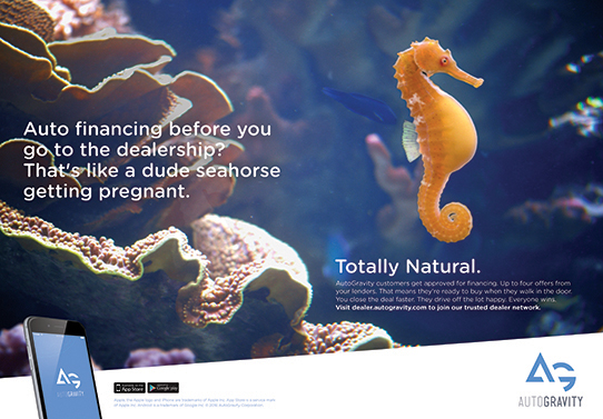 | AG "SEAHORSE" 0:30 We thought AutoGravity's unconventional approach to auto financing deserved some equally unconventional spokesthings. So we made equally unconventional spokesthings. CREDITS AD: Andrew Kapamajian CW: Jeff Kwiatek ECD: David DeRoma |
