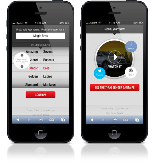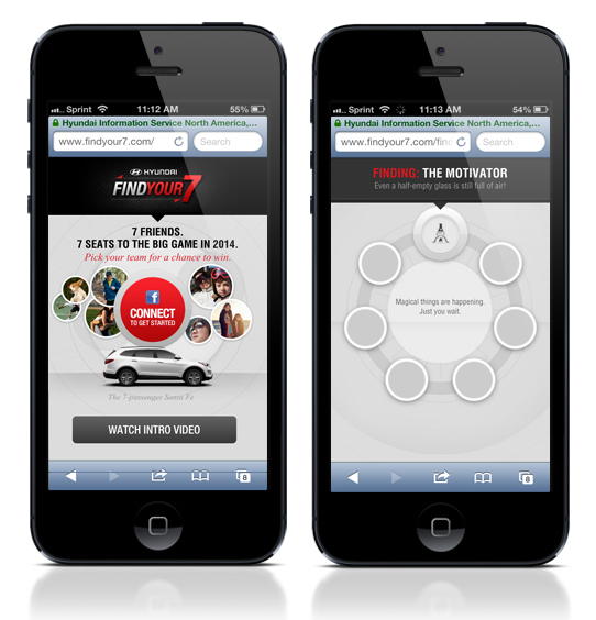| FIND YOUR 7 With television nowadays being a multi-screen experience, we knew promoting the new 7-passenger Hyundai Santa Fe during the Super Bowl would take more than a 30-second spot. So we extended the story to the second screen in a completely fun, social, and magical way. Winner 2013 IAB MIXX Award for Mobile Destination Site: Bronze. |